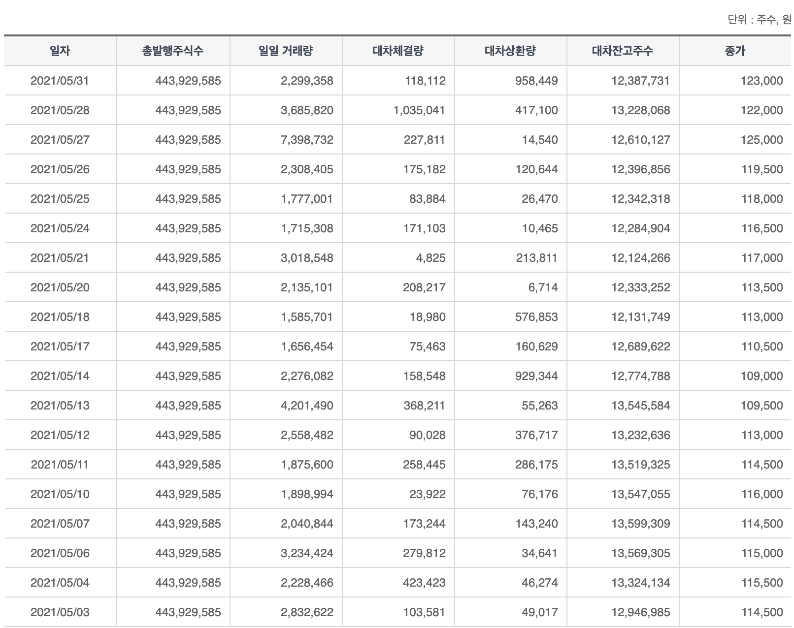 위의 사진은 카카오의 2021년 5월달 대차거래량을 나타낸 표입니다.