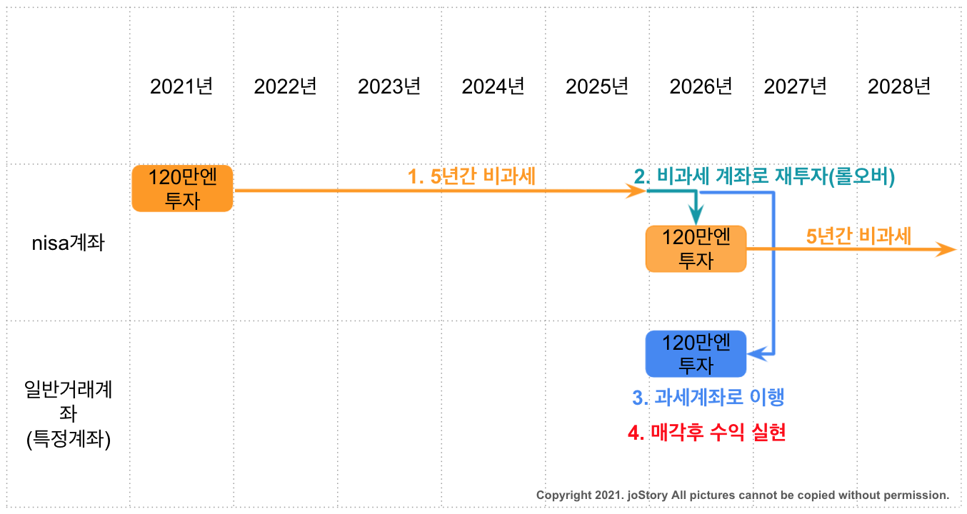 이런 경우는 사진의 1. 5년간 비과세로 적힌 그대로 투자신탁의 배당 등 이익이 있었을지라도 세금은 0엔이다. 비과세 기간 5년이 지나면 2. 비과세 계좌로 재투자하거나 3. 과세 계좌로 이행시키거나 4. 매각하고 수익실현을 할지 선택할 수 있다. 만약 비과세 계좌로 재투자할 경우 해당 연도 nisa의 남은 범위만큼 재투자가 가능하고, 과세 계좌로 이행시키면 해당 연도부터 투자한 상품에서 생긴 이익에 대해 세금을 내야 한다.